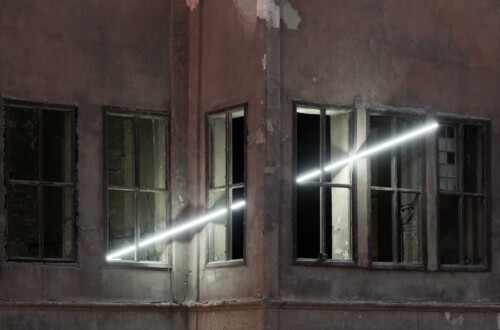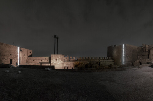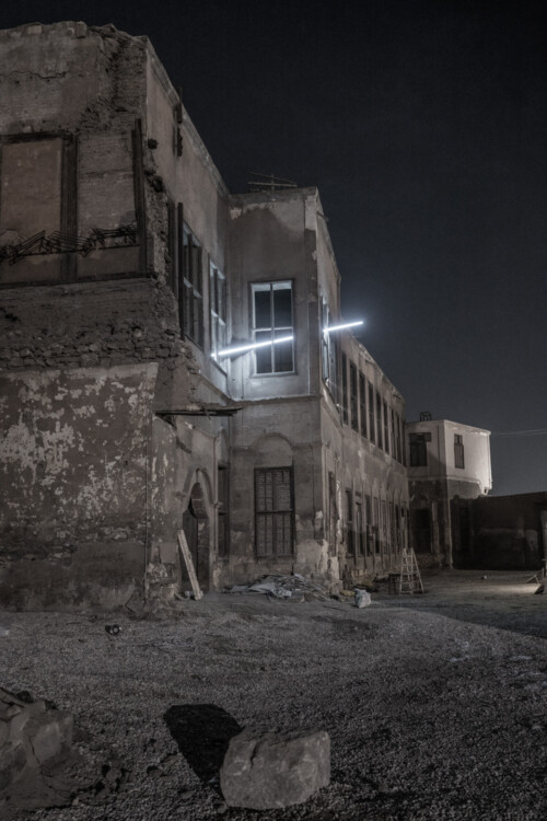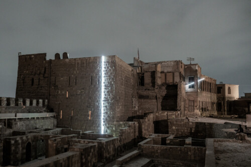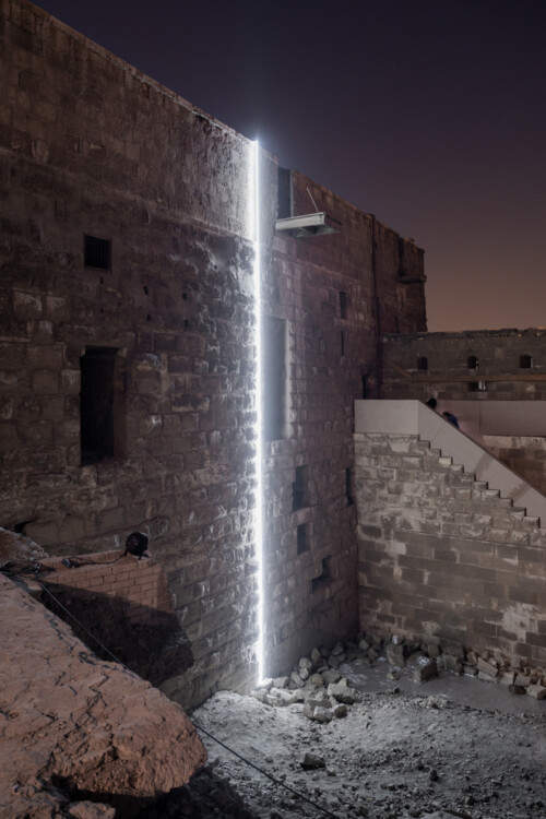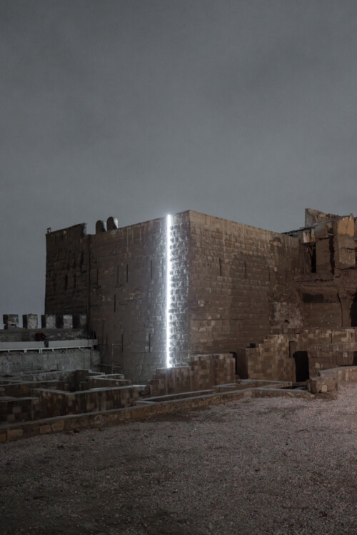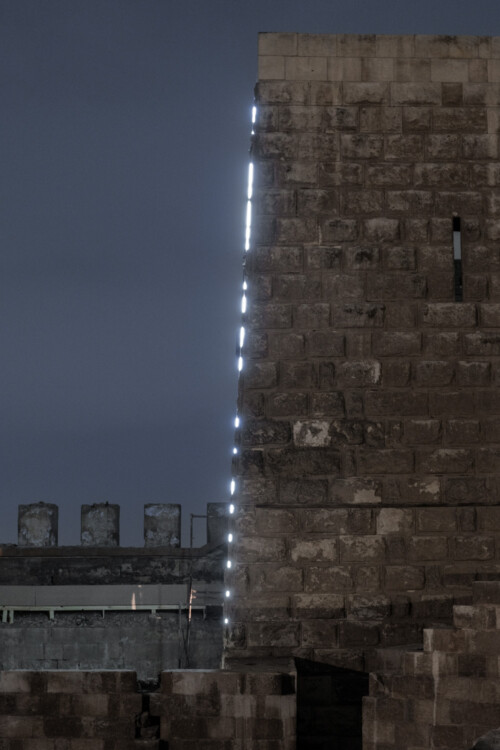 Space Shared/Divided consists of three lines of bright white light: two on the opposite watchtowers inside the Citadel of Salah Al-Din and a third one penetrating the Red Palace, a colonial British military office, suggesting a trajectory. The space itself and the time we live in significantly influenced the final shape of the installation. With its minimalistic form, the work deals with the tension between borders and spaces.